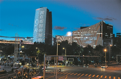 当日,北京中关村中钢大厦、望京社区楼体、奥林匹克公园观光塔等多个点位建筑外墙和户外大屏同时“点亮”,迎接9月将在北京举行的2021年中国国际服务贸易交易会。这是在北京市海淀区中关村大街拍摄的2021年服贸会户外灯光展示。