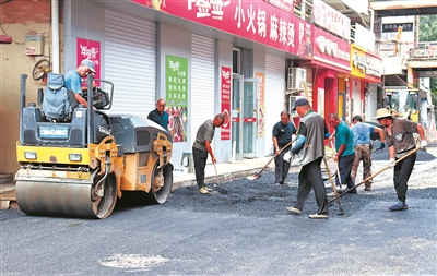 为有效改善城区交通环境,我市有关部门对存在破损的次辅街路进行整修。图为施工人员在凯虹市场铺设路面。本报记者 高强 摄