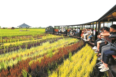 近日,辽宁省沈阳市沈北新区锡伯龙地创意农业产业园的稻田画进入观赏期,多种色彩的水稻组成稻田画,吸引众多游人前来观光体验。游客乘坐小火车在稻田中观光游览。