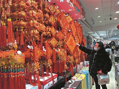 除了米面粮油和蔬菜肉类,作为新春佳节必备的春联年俗用品也销售火热。在铁西区一家商场内,记者随机走进一家专卖春联、灯笼、福字等年俗用品的铺面,店内中国结、“福”字装饰、春联样品种类繁多,大红灯笼高高挂在墙上,货摊上还摆了各式各样的红包袋,年味十足。在店里,记者看到一对母女正在仔细挑选“福”字窗花。