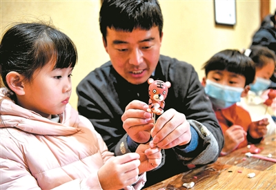 农历虎年春节临近,人们制作各类“虎”元素手工艺品,表达美好祝愿,迎接春节到来。1月18日,在安徽省亳州市花戏楼景区国艺面塑馆,面塑老师教孩子们捏制萌虎面塑。 新华社发(刘勤利 摄)