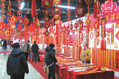 临近春节,我市商场超市、大街小巷,处处洋溢着年味儿。图为万达年货大集,市民选购春联、贴画等年节喜庆用品。