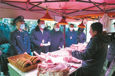 为进一步筑牢食品安全防线,市市场监督管理局联合市公安局食药环犯罪侦查支队以城乡结合部、大中型超市、农贸市场等食品生产经营单位为重点检查对象,以肉制品、调味品、白酒、饮料等日常消费的大宗食品为重点检查内容,开展节前食品安全检查工作。这是在铁西区八马路早市进行检查。全媒体记者 宋莹莹 摄