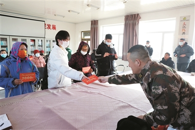 在分红大会上,武警四平支队相关负责人亲手将3.8万元的产业分红发放给46名英额堡的村民;为村内15名困难学生发放了1.55万元的助学全;并代表支队长和政委为结对帮扶的两名高中生发放1000元助学金;为村内10名生病的村民发放价值1万元的各类药品。