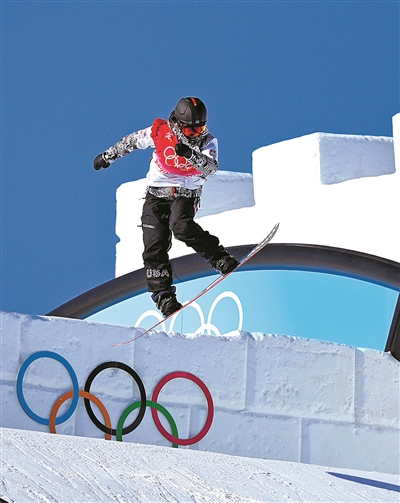 2月6日,美国选手朱莉娅·马里诺在比赛中。当日,北京2022年冬奥会单板滑雪项目女子坡面障碍技巧决赛在张家口云顶滑雪公园举行。
