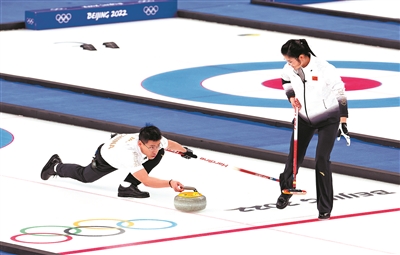 2月6日,中国队选手范苏圆和凌智(左)在比赛中。当日,在北京国家游泳中心“冰立方”举行的北京2022年冬奥会冰壶混双循环赛比赛中,中国队以5比6不敌英国队。