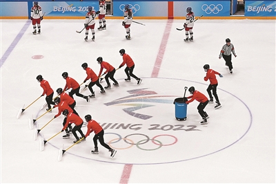 在国家体育馆冰球赛场上,冬奥会冰球比赛激战正酣,除激烈拼抢的各国运动员外,每一场比赛都能见到一群身着红衣的少年在赛场上穿插忙碌,为比赛的顺利进行提供保障,他们就是国家体育馆清雪保障“雪童”团队。据了解,冰球比赛中球员高速滑行和频繁转向会大面积磨损冰面并刮起大量冰屑,从而影响冰球滑行速度和轨迹,因此需要及时清理和修复。这就要求“雪童”在极