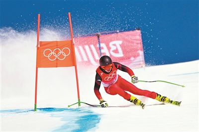 2月10日,中国选手徐铭甫在比赛中。当日,北京2022年冬奥会高山滑雪男子全能比赛在延庆国家高山滑雪中心举行。