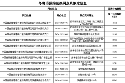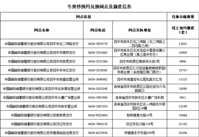 中国邮政储蓄银行四平市分行承办冬奥币、冬奥钞再次预约兑换的地区为:四平、梨树、伊通、双辽(市、县)的部分地区。其中:预约兑换网点共11个,其他网点不提供预约兑换服务(具体预约兑换网点及分配额度附后)。
