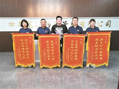 本报讯(通讯员 刘胜男 王新依)近日,海丰园社区副主任王鹤燊将四面写有“敬业高效办实事,疫情防控为人民”等字样的锦旗送到了物业公司四平龙廷物业经理付殿革、客服主管贾延鹏以及客服管家李多、刘胜男的手中,表达了社区对龙廷物业的满满谢意。