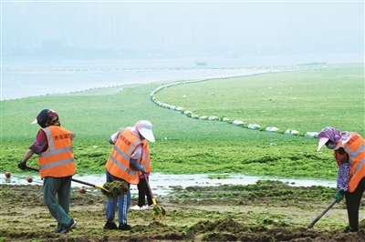 近期,随着海水温度逐渐升高,山东省青岛市海岸线的浒苔有所增加。当前,青岛市已启动“近岸海域浒苔应急处置”预案,积极组织市政、环卫、渔业等部门,通过“海上打捞、近岸阻拦、岸域清理”的方式进行处置。7月4日,环卫工作人员在青岛市市南区第三海水浴场海滩上清理浒苔。