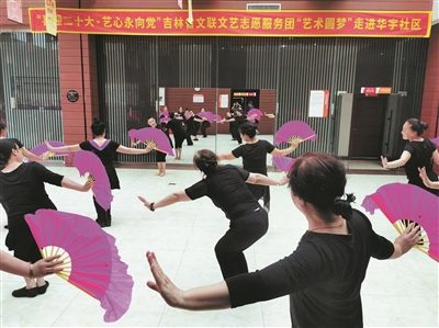 喜迎二十大,“艺”心永向党。7月5日,中国舞蹈家协会顾问、吉林省文联副主席、吉林省舞蹈家协会主席王小燕带领省文联文艺志愿服务团“艺术圆梦”走进四平华宇社区,分别就舞蹈、歌曲、戏曲和书法等科目,开展辅导培训等文艺惠民活动,用实际行动送欢乐下基层,与社区居民心贴心交流,把精神文化食粮和欢歌笑语送到四平群众之中,把党的声音和关怀送到百姓心间,让华宇居民在家门口享受到优秀的文化艺术成果,为华宇居民献上了一场精彩纷呈的文化盛宴。