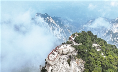 7月份西岳华山继续面向全国游客实行免门票政策,每日最大接待量调整至20000人次,步行登山限流6000人次。据统计,6月份华山景区累计接待游客量增至28.9万人,经营收入大幅提高,同时带动周边餐饮、住宿、交通等关联消费的快速增长。游客在华山西峰游览。