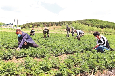 梨树县孟家岭村裕丰种植专业合作社2021年流转土地50亩,开始发展中草药种植,现种植射干、辽藁本等中草药,预计年增加村集体经济收入5万元。这是村书记带领合作社社员在地里除草。