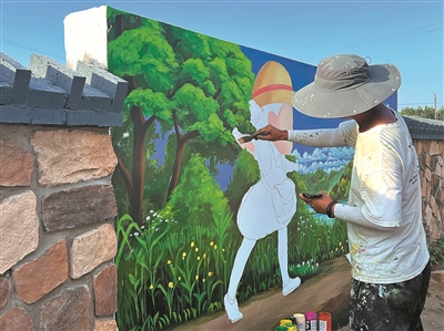 双辽市双山镇百禄村结合本村现有产业、文化等特点,构建乡村旅游发展模式,打造了“乐活小镇”农旅融合乡村旅游项目,这是在项目建设现场,工作人员正在进行墙体彩绘,使昔日单调的白墙上多了一幅幅形态鲜活、色彩鲜明的手绘墙体画。