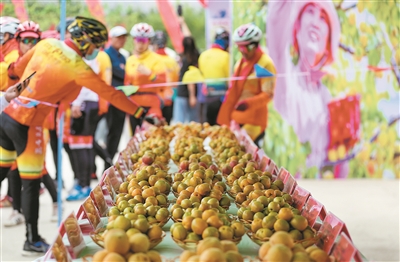夏日,位于祁连山下的甘肃省酒泉市金佛寺镇的李广杏进入丰收季,吸引游人前来采摘,体验田园风光。李广杏是金佛寺镇的特色农产品,近年来,当地通过搭建电商平台,开展网络直播带货,举办李广杏采摘节等拓宽销售渠道,促进农民增收,助力乡村振兴。图为采摘节现场,游人在品尝鲜杏。 新华社发(侯崇慧 摄)