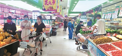 炎炎夏日,水果是家庭必不可少的食物,很多水果凭借着丰富的维生素成为男女老少的最爱。这是某超市内市民在采购水果。