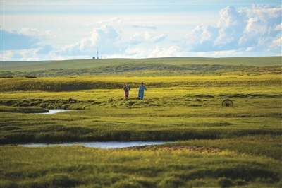 夏日,内蒙古锡林郭勒盟西乌珠穆沁旗的草原绿草如茵,风光旖旎。一对蒙古族青年在西乌珠穆沁旗巴拉嘎尔河畔行走。