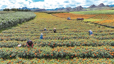 近年来,云南省蒙自市冷泉镇充分发挥自身资源优势,把种植万寿菊作为助推乡村振兴的一项重要产业来抓,有效促进当地群众增收致富。在云南省红河哈尼族彝族自治州蒙自市冷泉镇老哈都村,村民在采收万寿菊。