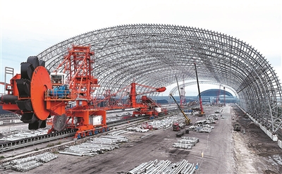 近日,河北省唐山港曹妃甸港区煤码头三期工程后续建设项目封闭式煤炭堆场条形储备仓建设正在稳步推进。据介绍,该储备仓储备设计能力93万吨,是曹妃甸港区推进煤尘抑制、减少污染的重要环保设施。工人在唐山港曹妃甸港区煤码头封闭式煤炭堆场条形储备仓建设工地施工(无人机照片)。