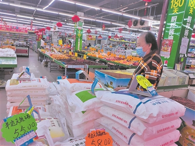 在我市各大超市销售的米、面有来自本地企业生产的,也有来自黑龙江、山东、内蒙古等地区的米面,让我市米袋子品种更加多样。图为铁东区某大型超市内,居民在挑选大米、白面等必需品。