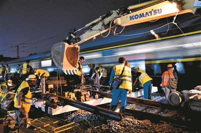 8月1日,中铁十局的工作人员在对大明湖站进行改造施工。 8月1日晚,由中铁十局承建的国家重点基建项目济(南)郑(州)高铁引入济南铁路枢纽工程的重要节点项目——大明湖站正式启动改造。改造完成后将实现济南西站、济南站、大明湖站至济南东站的互联互通,满足济郑高铁、京沪高铁、石济客专的跨线营运需求。 新华社记者 郭绪雷 摄