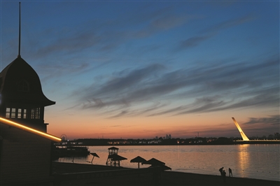 中秋假日,冰城哈尔滨市的松花江畔夜色迷人,吸引市民前来赏景游玩。市民在松花江畔欣赏傍晚江景。 新华社记者 王建威 摄