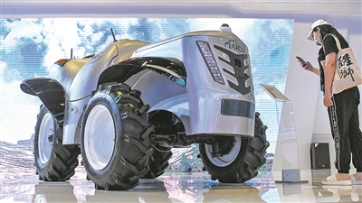9月17日,在广西南宁举行的第19届中国—东盟博览会上,高新科技产品引人关注。一名参观者在观看一款无人驾驶拖拉机。