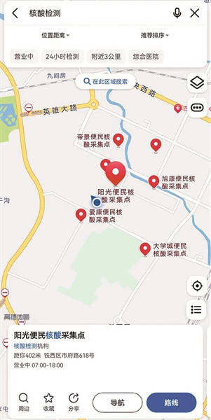 据了解,便民核酸采样点具体位置已在高德地图和百度地图上标注,只要在高德地图和百度地图APP中搜索“核酸检测”,即可看到附近的便民核酸采样点。点开后可查看具体位置、距离、抵达时长等信息,点击页面下方的“导航”或“路线”,还可实现一键导航或规划路线前往。