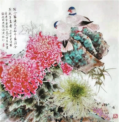 陈连桂作画,无论竖幅、横幅、方幅,章法都十分考究,疏密得当、主次分明、留白适度。以花为主自然花为主体,以鸟为主则反之,从不见花鸟并举的败笔。偶有画前考虑不周之处,或花头或鸟形,他认可重画,也不把带有瑕疵的作品示人。他钦慕古人的才具画艺,钦敬前人的品行学识 ,清代画家恽南田的“只爱柴桑处士家,霜丛载酒问寒花。秋窗闲却凌云笔,自写东篱五色霞。”这首诗句,他画菊时也时常题记。他60岁做电视专题片时自作诗一首:岁逢花甲画菊黄,秋容淡淡晚来香。笔端勾得花魂醉,别梦依稀惜时光。抒发自己一生特别是晚年衷情花鸟画的情怀,其中对菊花更是情有独钟!