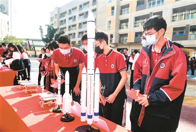 11月2日,重庆市朝阳中学学生在活动现场参观航空航天展品。 当日,“科技强国 强国有我”2022年科技大篷车全国巡展走进重庆暨重庆市朝阳中学科创教育成果展示活动拉开帷幕。 此次活动共设置“遇见科技”“感受科技”“了解科技”“共筑未来”四个部分,涵盖了人工智能、航空航天、物理、地理等学科知识,让同学们感受科技的魅力,帮助他们更好地树立科学思维、了