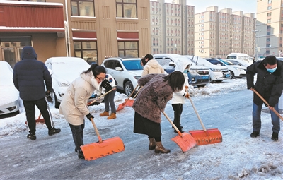 日前,受降雪天气影响,铁东区部分街道积存冰雪,为方便群众正常出行,铁东区广大机关干部第一时间下沉社区开展清扫作业,迎严寒、战风雪、保畅通。