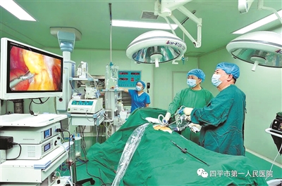 腹腔镜手术与传统手术相比具有瘢痕小、疮口易愈合的优点,深受患者欢迎。这是市第一人民医院普外科主任张永喜带领团队为患者实施腹腔镜手术。