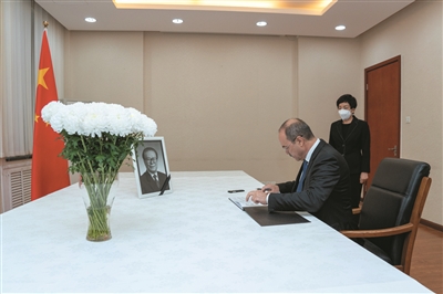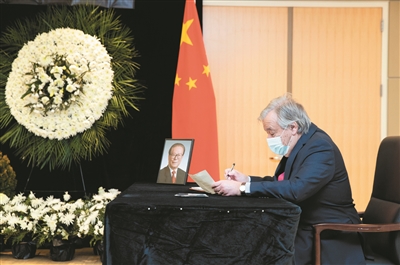 十二月五日,联合国秘书长古特雷斯在中国常驻联合国代表团驻地吊唁江泽民同志。