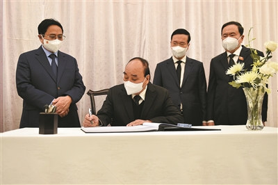12月2日,越南国家主席阮春福(左二)、总理范明政(左一)等在中国驻越南大使馆吊唁江泽民同志。