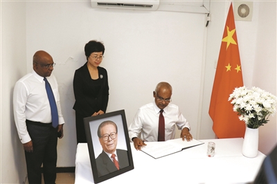 | 12月5日,马尔代夫总统萨利赫(右)在中国驻马尔代夫大使馆吊唁江泽民同志。 新华社发(中国驻马尔代夫大使馆供图) |