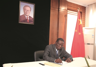 十二月五日,津巴布韦总统姆南加古瓦在中国驻津巴布韦大使馆吊唁江泽民同志。 新华社发(肖恩·朱萨 摄) |