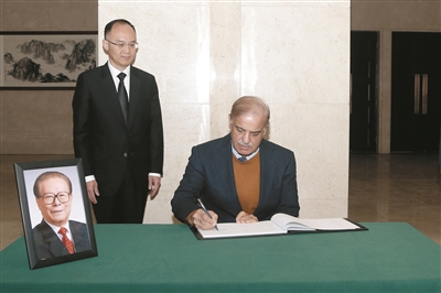 | 12月1日,巴基斯坦总理夏巴兹在中国驻巴基斯坦大使馆吊唁江泽民同志。 新华社发(艾哈迈德·卡迈勒 摄) |