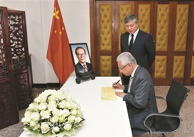 12月6日,马来西亚总理安瓦尔(右二)在中国驻马来西亚大使馆吊唁江泽民同志。