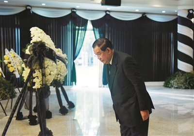 | 12月5日,柬埔寨首相洪森在中国驻柬埔寨大使馆吊唁江泽民同志。 新华社发(万坡 摄) |