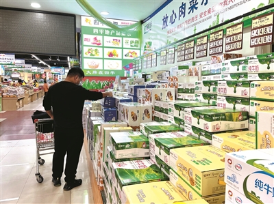 随着市民生活质量的提高,人们对健康的要求越来越高,而牛奶作为营养丰富的饮品,深受消费者的喜爱。这是市民在铁东区一家超市购买牛奶。