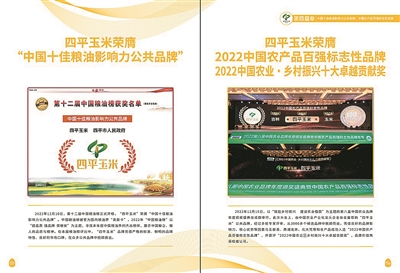 为彰显四平玉米品牌价值,塑造玉米主食化健康理念,向业界和社会传递品牌价值发展成果,四平玉米品牌建设捷报频传,入驻“中国农产品地理标志品牌形象馆”,在“云上”持续全面的让国内、国际上更多人了解“中国优质玉米之都”,感受“四平玉米”的品牌魅力。荣膺第十二届中国粮油榜十佳粮油影响力公共品牌,彰显了四平玉米品牌的影响力和生命力,也是对我市品牌建设方面投入与深耕的认可。入选2022年中国农产品百强标志性品牌,并获评“2022中国农业·乡村振兴十大卓越贡献奖”,展现了四平玉米品牌影响持续攀升的良好态势,有力助推四平玉米走向全国,走进消费者视野。