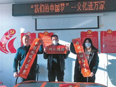 1月10日,双辽市文联工作人员深入柳条乡白牛村开展“‘我们的中国梦’文化进万家”活动,为村民赠送春联、“福”字,为他们送上了新春祝福。