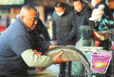 春节临近,各种年集热闹红火。人们选购年货,迎接新春佳节。1月17日,在山东省滕州市西岗镇年集上,一名摊主售卖鲜鱼。