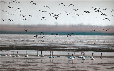 2月3日,一群天鹅在黄河湿地嬉戏。近日,黄河西岸的合阳黄河湿地自然保护区内,天鹅今年首次规模出现,数量近千只。合阳黄河湿地自然保护区位于陕西省合阳县,保护区内芦苇遍地,鱼塘、台田交错排列。近年来,合阳县采取退耕还湿、恢复退化湿地等多项措施保护湿地生态系统,生态环境明显改善。目前,保护区内的黑鹳、丹顶鹤、灰鹳、白琵鹭等国家一、二级重点保护野