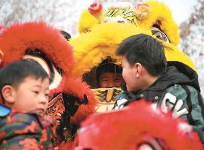 2月6日,社火团队的小演员在表演间隙嬉戏。 当日是农历正月十六,在河南省浚县举行的正月古庙会上,几十支社火团队轮番表演,踩高跷、扭秧歌、耍狮子,锣鼓喧天,热闹非凡,形成一道富有特色的中原文化景观。河南省浚县的正月古庙会已有1600多年历史,有“华北第一庙会”之称,被誉为民俗文化的“活化石”,是中国民间文化保护工程项目、国家级非物质文化遗产。