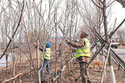 近日,市园林处工作人员对南河两岸树木开展维护,巩固绿化成果,美化家园。全媒体记者 张舰 摄