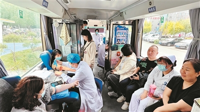 献血车上,血站工作人员有条不紊地进行资料登记、血液检测、量血压等工作。市中心人民医院献血职工积极配合血液采集各项工作,现场秩序井然。