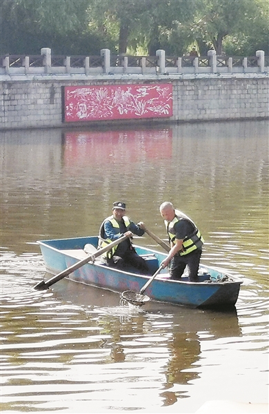 为了确保河道水质,日前,我市水利部门河道维护人员顶着烈日仔细清除河道内杂物,为市民提供干净清澈的河道环境。