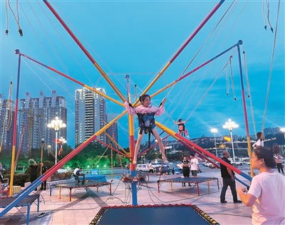 近日,在铁东区万达广场户外儿童活动区,各种儿童游乐项目备受欢迎,众多家长带孩子在此体验游戏乐趣。